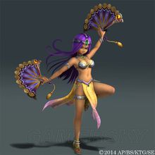 战斗特征:由于手拿扇子一边旋转一边攻击,拥有长按Y键或在跳跃时按下Y键等各种对所有方向发动的攻击。不止如此,还是能远距离攻击的万能型角色。搭配广范围的强力特技,使出犹如舞蹈般的连段吧。因每一下攻击的威力并不高,建议以攻击次数取胜。