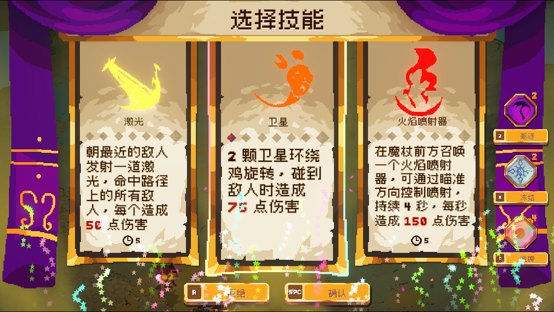12、当等级突破后,就可以进入三选一技能阶段,玩家还可以在屏幕右侧对此次的三技能做出操作,比如冻结可以将此次的三种技能留到下一次升级后选择。