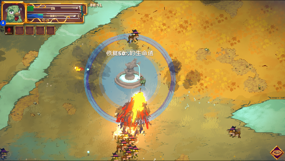 13、游戏中会后有各种随机的建筑,比如可以帮助回血的喷泉,这可以帮助魔鸡走的更远。