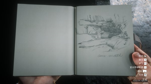 只是顺便一提,这个山洞同时是一个景点。景点是指能够长按E检查、在日记本记录、在地图上画画的地点。记录一个景点是游戏100%完成度所需