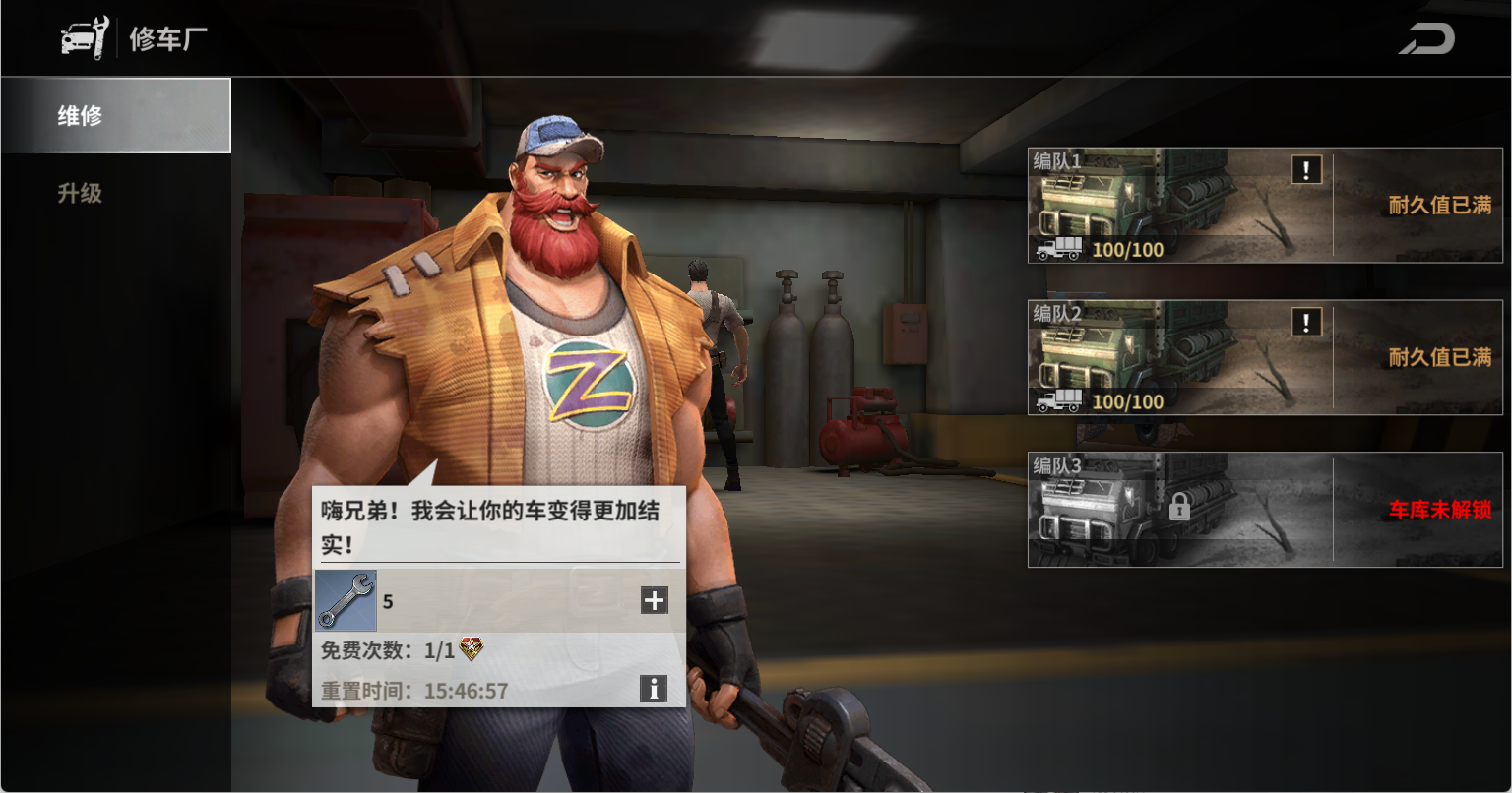 每天零点,车库都会刷新免费的维修机会,在车库里进行维修,可以恢复运兵车耐久值。