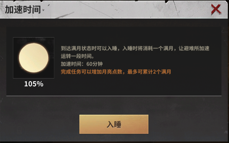 我们需要时刻关注月亮的点数。当月亮点数达到100%的时候,点击后可以进入睡状态,随后时间会进行加速。但是点击前要把确认所有的避难所设施都在工作噢,这样的话可以使游戏进度的效率最大化,包括建筑、科技研究、以及士兵训练、发电厂和地鼠发电机。
