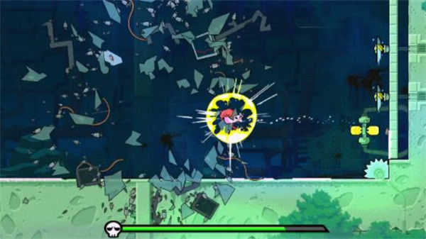 2、当然我们也不是完全无法操控角色的行动,玩家大部分时间能用的按键只有两个——空格键:跳跃/出拳;↓键:滑铲。通过跳跃或滑铲,玩家可以躲过齿轮等陷阱;出拳,可以打倒眼前的敌人(跟马里奥一样,碰上会被秒杀)或是冲刺,如果需要改变前进方向,则要进行“登墙反跳”的操作。值得注意的是,如果角色碰到关卡反方向(通常是屏幕左边)的边界同样会被秒杀,大部分情况下当你开始“换个方向进攻”的时候,结局就已经注定了