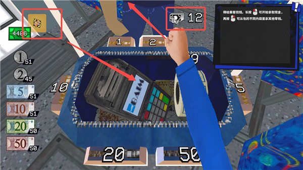 5、需要找零的钱显示在左上角,先左键长按10元的,在右键点击2元的,将找零的钱递给乘客。