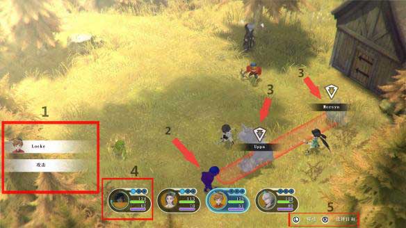 2、将要进攻的我方角色;充分利用好角色的职业优势(如图,Locke使用的是弓弩,可以对一条线上的敌人进行穿刺攻击,我们这样安排会使他同时集中两个目标)