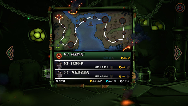 2、跟随音乐节拍,爆破、弹跳、飞跃,躲避障碍物、消灭敌人、点燃引信,造成最大混乱!躲避扫兴鬼黑默丁格的追击,造成无穷音乐混乱,完成自己的使命——制造史上最伟大的巨型炸弹!