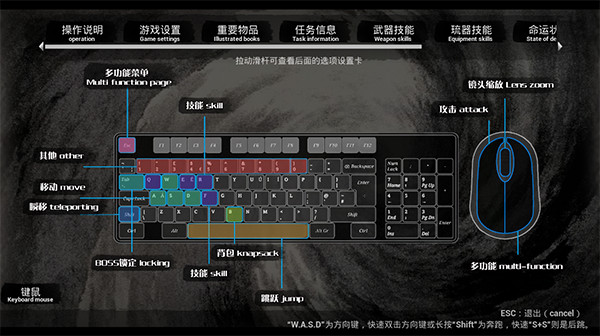 移动:W,A,S,D,双击方向键或者长按shift为跑,快速s+s为后跳。