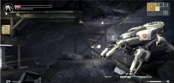 往右边走则发现妹子刚好被直升机带走,玩家并追不上。而且同时会有一个双足机器人和两个杂兵来阻止玩家前进的道路。战斗的方法同之前的大型机器人,鼠标抬高一点往底下扔手雷就可以了。如果手雷扔完还没有打败的话,那就需要用到手枪了。玩家可以在钢制箱处蹲着来规避伤害。另外,钢制箱附近的地面上存在橘光的挡板,用手枪打破后进入下面的空间。可以获得手雷的增强包。