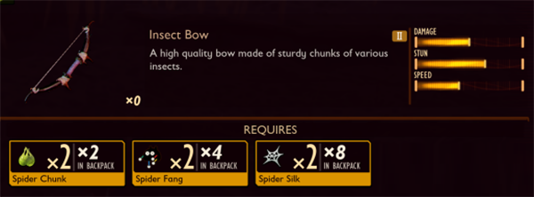 普遍材料~绳子,豆芽叶,石头之类的就不说了,这些满地都是。说说主要的材料。弓箭需要打苍蝇爆的材料。苍蝇在有水的附近就有,大水溏附近很多。箭支需要打跳蚤爆的材料,跳蚤也很常见不都说。箭支另一种刺的材料需要砍植物才有。跑地图的时候你抬头看下头上一朵大红花的那种植物你去砍它的叶子就行了。