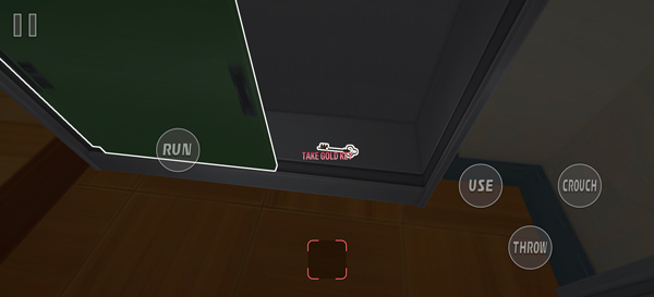3、游戏采用第一人称视角,左侧虚拟轮盘控制角色移动,RUN为奔跑键,USE拾取互动键,CROUCH蹲下键;