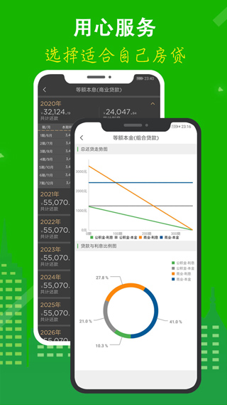 2、提供每月详细的等额本息和等额本金的商业还款报告/公积金还款报告/总还款报告。更为直观的统计报表及月供图表,一目了然的月供数据,让您的更清晰直观了解数据。