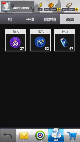 除了玩法和枪械以外还设有道具,其道具主要分三种:放大,无风,体力,顾名思义名字和其意义完美匹配。