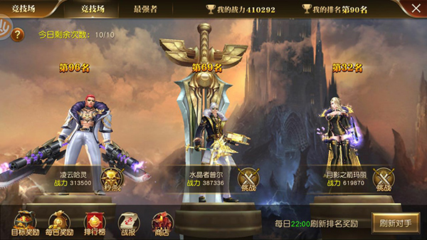除了挑战完会有声望,竞技场每日晚上22:00会根据当前排名来进行结算,排名越高奖励越多。