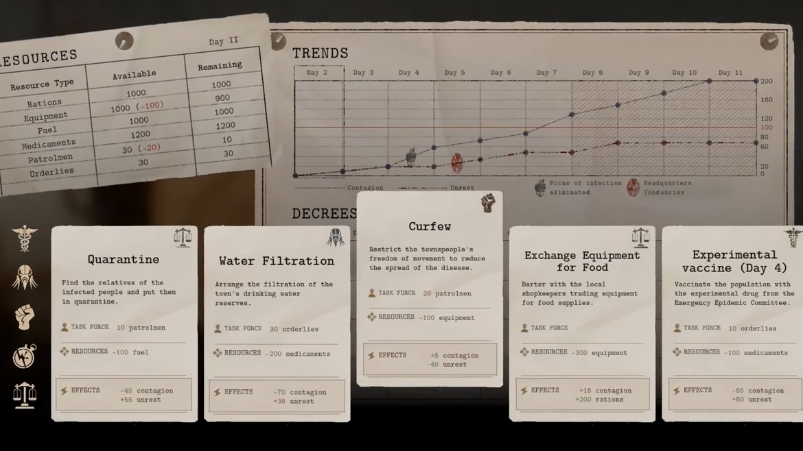 每一个新的一天而奋斗。通过实施你自己的规则来确保城镇的生存:强制执行宵禁,没收珍贵的药品,给居民接种疫苗,镇压骚乱,部署巡逻队,宣布宵禁。