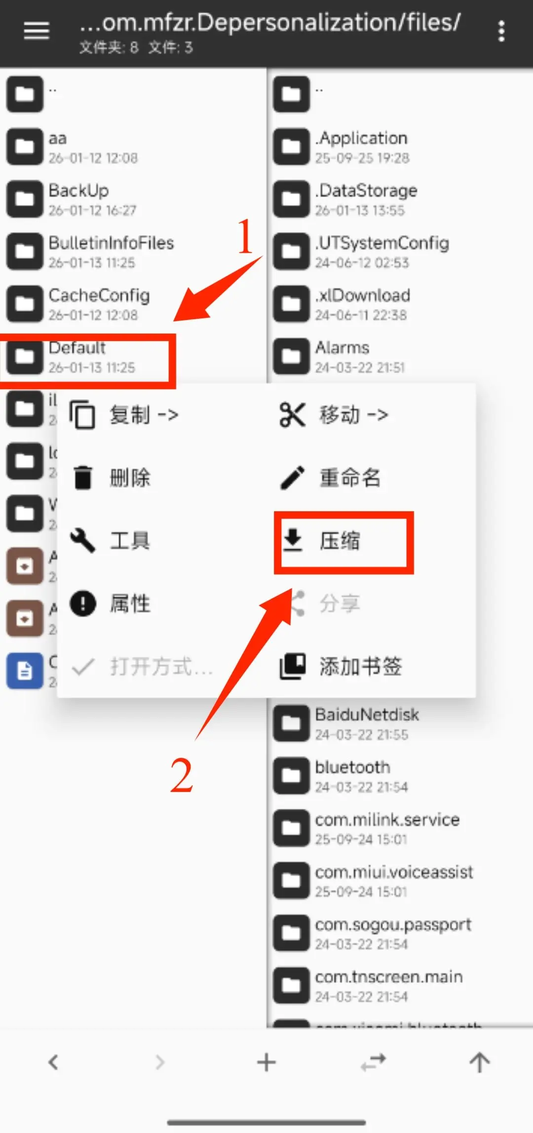 6、点开【files】文件夹,长按【Default】文件夹,选择【压缩】。