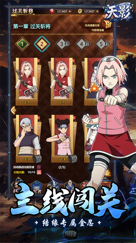 天影0.1折手游是一款火影忍者横版卡牌策略游戏,此版本为玩家内置0.1充值福利,创角即送纲手,登录活跃送大蛇丸、我爱罗,海量资源,影级忍者免费拿!天影火影忍者手游深度还原原作经典剧情脉络,从木叶村的日常修炼到忍界大战的巅峰对决,每一帧画面都承载着火影迷的热血回忆,玩家可自由组合角色卡牌阵容,释放千鸟、螺旋丸等标志性技能。游戏除了章节闯关模式外,还提供忍者对决、修行考试、终结之谷、忍者大战等玩法等你挑战。