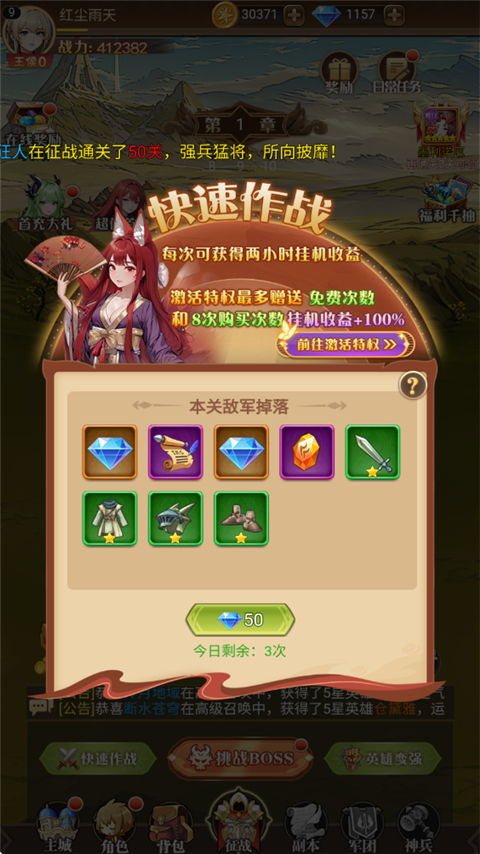 1、每日免费的召唤、点金和快速作战千万别错过啦。