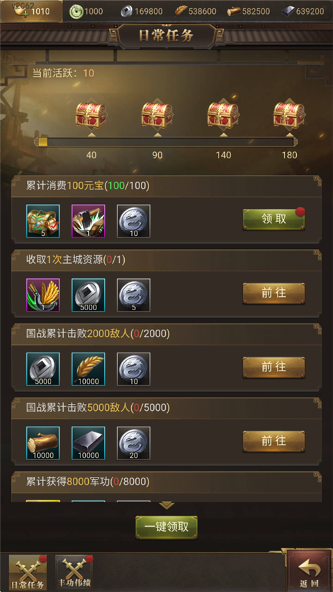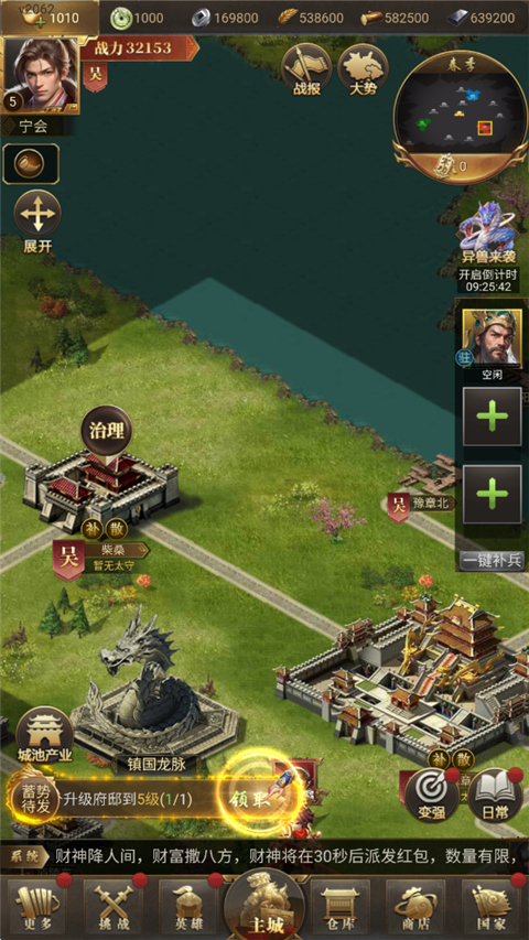 每当新占领一个城池时,城池上会出现治理任务,完成可以获得大量资源和元宝奖励,并解锁城池的建设