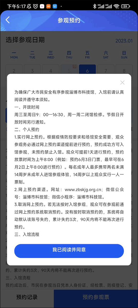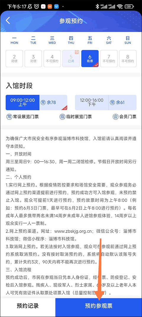 2、进入预约界面后根据自己的时间以及科技馆开馆的时间进行合理调配,然后选择参观日期和时间段,最后点击预约参观票。