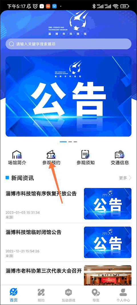 1、进入淄博市科技馆app主页,点击主页的参观预约。
