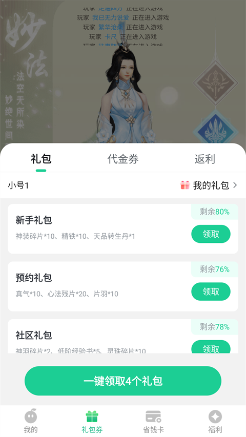 2、切换到礼包这里,我们选择一键领取礼包兑换码。