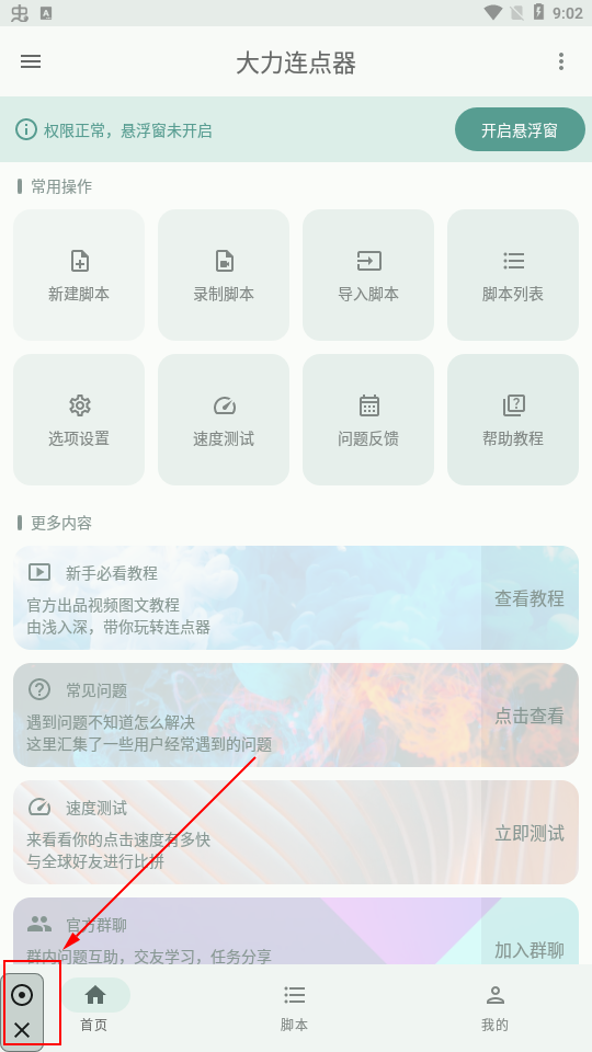 1、首先下载安装大力连点器软件,然后用微信、QQ或者手机号进行登录,来到软件首页,授予权限。
