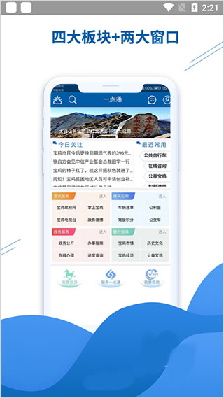 宝鸡服务一点通app是由陕西关天大数据有限责任公司推出的一款专门为宝鸡市民打造的政务服务软件,界面清晰明了,主题设计风格简单,给用户一种看着舒心,用着顺心之感,也为宝鸡市民打造智慧城市生活、让用户享受方便快捷的生活体验。其中包含宝鸡区各大新闻媒体、生活服务等功能,全面展示城市热点、民生起居、等相关行业信息,为用户全面覆盖宝鸡地区的精彩新闻资讯,以及提供公交车票、美食景点等等。不仅如此,用户还能在宝鸡服务一点通中进行预约挂号、医疗机构、医疗价格、医疗保险等操作,缩短就医流程,让用户无需跑腿,线上即可进行操作,也为用户节省大量时间,那么有需要的用户欢迎下载体验。