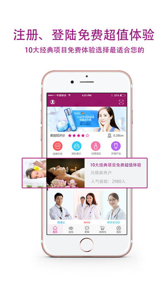 用户可参加限量秒杀、节日特价、今日上新、新客超值体验等项目;也可通过克克美首页对美容院进行更全方面的了解并与之互动,如购买服务项目,在线预约、在线聊天等与美容院老板和美容师更方便的沟通和交流。