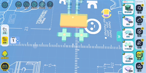 为方便操作,在正式开始搭建前,需将设置中的编辑视角更改为【上帝视角】。在机关中找到“齿轮”并拖出,即可实现“齿轮”摆放的基础操作。除了正常的摆放外,还可以点击【旋转】将“齿轮”旋转至竖起,也可以调整【缩放】调整“齿轮”大小及侧面的宽度。待尺寸设置完毕后,点击左侧【复制】按钮,即可批量复制已调整好的组件,达到节省时间、提高效率的效果。