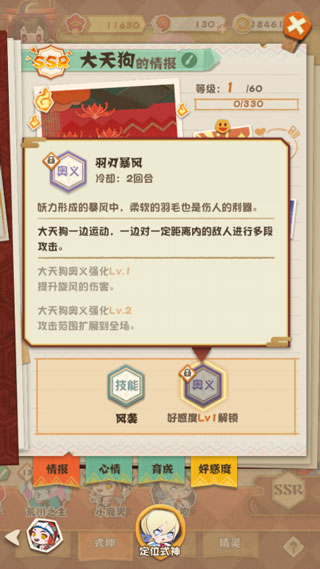 最后来说说少羽大天狗,目前来说少羽可以说是整个妖怪屋中输出最强的天花板,如果使用得当能够打出非常极限的伤害。不过由于抽取难度较大,少羽大天狗在强度上对于奥义的要求比其他几位式神要小一些,本体不需要奥义最高理论上就可以造成5040%的奥义伤害。而在提升到奥义一和奥义二后,能够提高小旋风的伤害以及小旋风的数量,达到奥义二后,极限5小旋风能够带来12840%的夸张倍率伤害,当然要达成这样的伤害量,需要极高的操作和位置,一般来说难度较大,但即便不是极限伤害,少羽大天狗依然能够造成极强的输出。