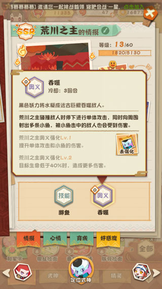 在使用方法上,荒川相比茨木来说也要简单不少,由于本身是单体输出,不太需要进行专门的设计,只需要尽量将奥义打在BOSS或者大怪身上就行了。不过如果遇到小怪挡路,可以先关闭奥义,等有机会再出手,毕竟荒川的奥义冷却有三回合,还是要好钢用在刀刃上才行。