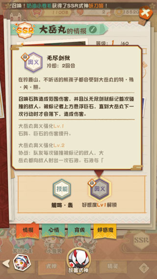同样作为最近经典的式神之一,大天狗在妖怪屋中的表现也是非常不错的,大天狗的奥义是群体攻击奥义,对于压制全场血量有着非常不错的效果,而升级奥义一后可以提升一定的大招伤害,而最关键的则是奥义二带来的全屏效果,在升级奥义二后,大天狗的奥义攻击范围会覆盖全场,能够大幅度减少地形环境带来的影响,让大天狗的输出更加稳定。