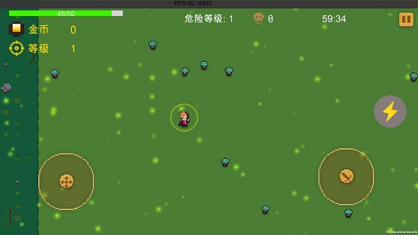 1、作为一款割草+Roguelike玩法的弹幕射击游戏,操作上比较的简单,在左下角的按钮,是控制角色移动的方向按键,反方向的则是射击按键。与以上谈及到的几款游戏不同,射击需要玩家手动控制,并非自动攻击,好处就是你可以自己控制射击的方向。