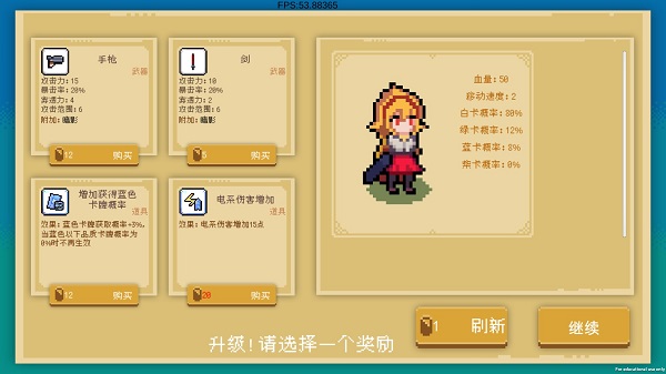 2、其次经验获取的方式也不同,以上所涉及到的游戏需要玩家拾取地下的能量块,而这款游戏则是消灭怪物即可增加经验,而怪物掉落的多以金币为主。拾取金币可以在升级界面中,购买新的武器、还能对现有武器进行升级强化,倘若其中没有你喜欢的武器或道具,可以通过刷新,改变场上选择。