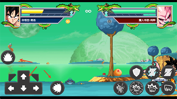 2、然后左边按键,右下角的拳头是平A,左侧是单段平A,第三个是重击,神龙图案的按键是连续攻击,需要消耗气,当气小于2格无法使用。上方的Z键是小技能,带有闪电的Z键是大招,护盾按键与前进方向键一起按可以防御,与后退方向键一起按可以摆脱敌人的连招。