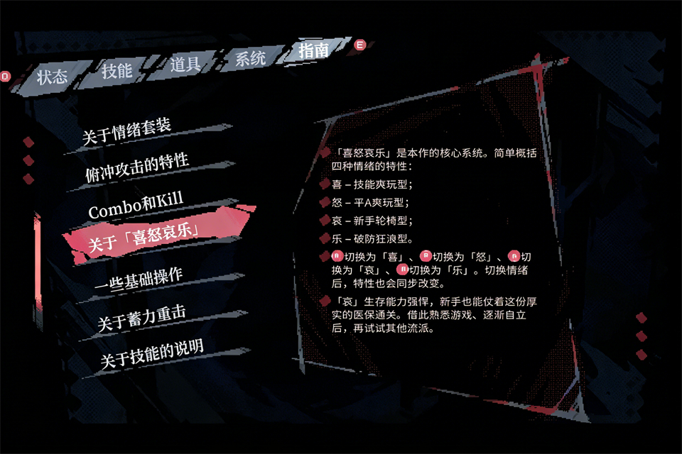 游戏战斗系统非常丰富,秦心有五种模式,喜怒哀乐,以及无情绪状态,喜怒哀乐对应有四套专属技能选择,每种状态可以额外选两种技能。