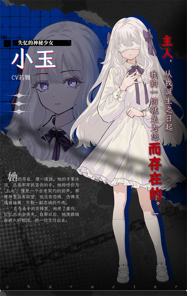 她的存在,像一道送。她的手掌冰凉,总是牢牢抓紧你的手。她称呼你为“主人”,像是一个古老契约的回声。那眼神里没有欲望,也没有恐惧,仿佛灵魂被抽离,只剩一副忠诚的外壳。在与杀手的交锋里,她受了重伤,记忆也完全丧失。自那以后,她便跟随你进入蜉蝣馆,把一切交付出去。
