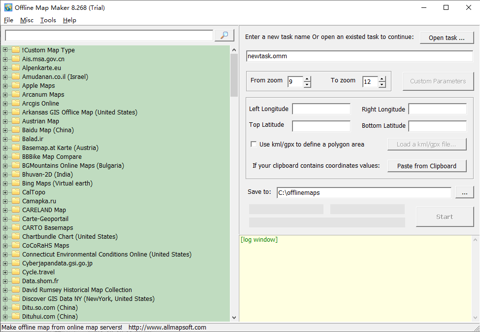 offline map maker官方版是由Allmapsoft设计的一款离线地图制作工具,该软件可以从谷歌地图、百度地图、bing地图、高德地图等国内外各大地图网站下载离线地图,并可以将地图导出为BMP、TIFF、JPG等格式的图片,无论是HTML网页文件,或者适用于OziExplorer软件的map格式文件,又或者是格式的sqlite数据库文件,都可以帮助用户轻松制作离线地图。