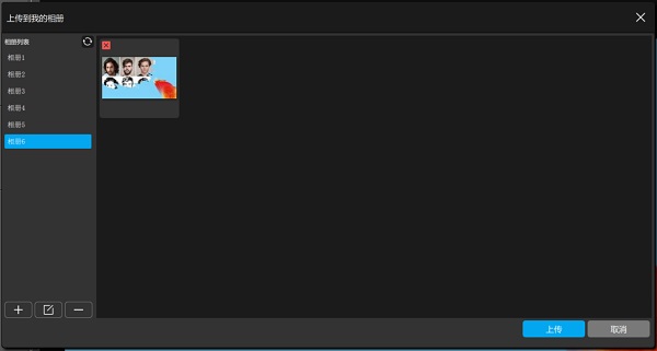对话框右侧上方的区域为当前所选相册的图片列表。下方为”上传“和”取消“按钮。
