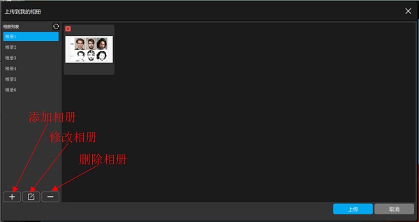 对话框左侧是当前登录用户的相册列表。列表下方的三个按钮分别为”添加相册“,”修改相册“,”删除相册“。