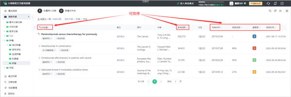 暂未分类文献、自建文件夹中的文献可以通过点击【文献标题】、【影响指数】、【发表时间】、【阅读进度】、【重要度】、【阅读时间】右侧的排序按钮,选择文献按照文献标题首字母、影响指数高低、发表时间顺序、阅读进度、文献重要度、阅读时间的顺序/倒序进行排序:第一次点击后文献按照降序排列展示,第二次点击后文献按照升序排列展示,第三次点击后取消文献排序。