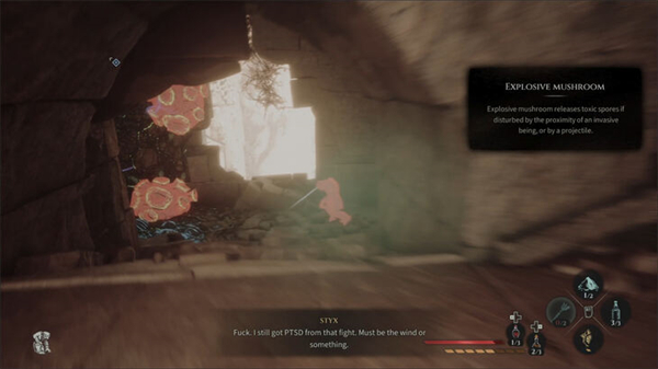 当你走出洞口时,你应该会看到右边还有另一个洞。里面会充满爆炸蘑菇和一个生物。