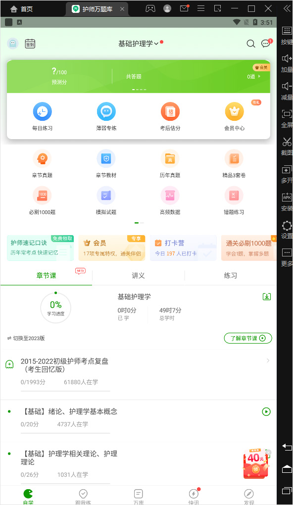 护师万题库电脑版是一款借助模拟器运行的资格考试备考软件,专门针对护师行业所打造,在这里,用户可查看海量的专业护师问题,提前熟悉考试的相关题型,实用性非常高。该软件提供了历年来护师资格考试题库资源,并支持在线模拟刷题、章节练习、错题分析、直播教学等功能, 可全方位为考生讲解各个重要的知识内容,让您的复习可以变得事半功倍。而且VIP用户可享受一对一精品助教,并更有真人客服实时在线为用户进行服务,以便随时帮助用户解决问题,同时,在护师万题库的新版本中还为大家进行了各项改善,不仅优化了会员体验感,还修复了若干已知bug等,致力为用户提供更好的使用体验感。