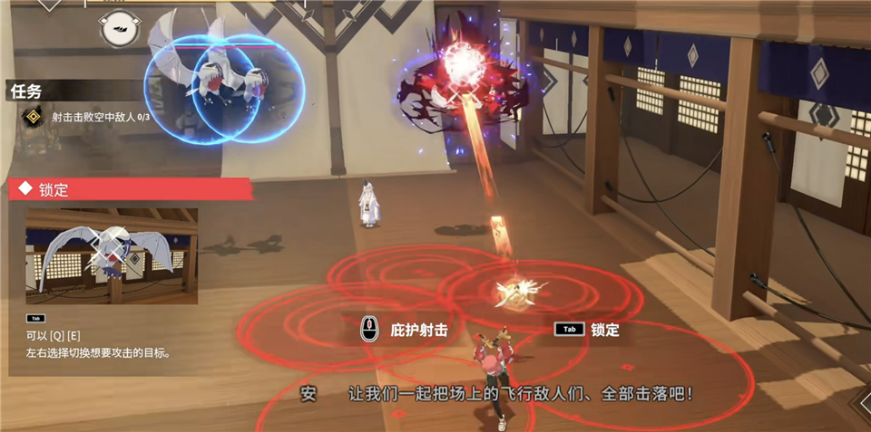 按鼠标中间滚轮可以操作安的辅助术式射出符咒,进行远程攻击,是对付射击护盾的绝佳利器,建议搭配Tab键锁定使用。