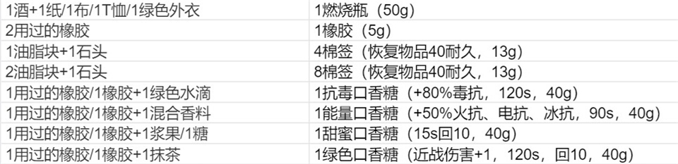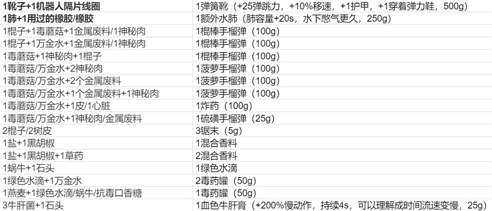 1)弹簧靴、额外水肺、榴弹、炸药、锯末 、香料、绿色水滴、毒药罐、血色牛肝膏