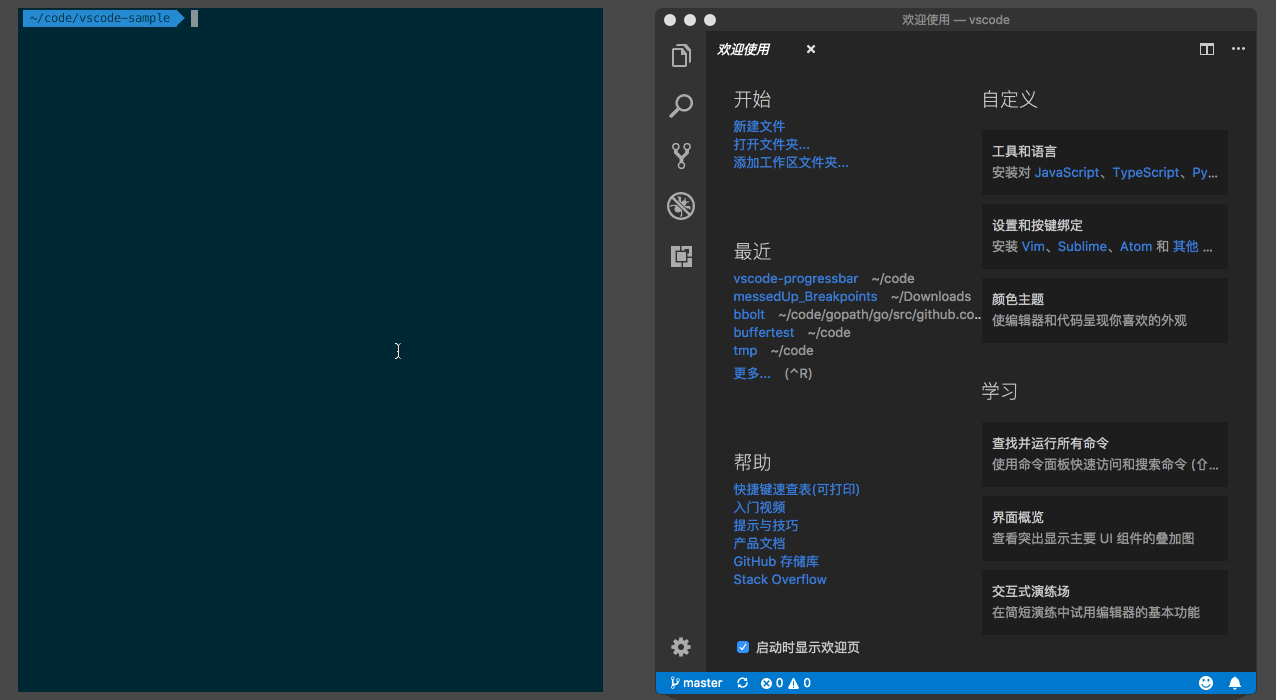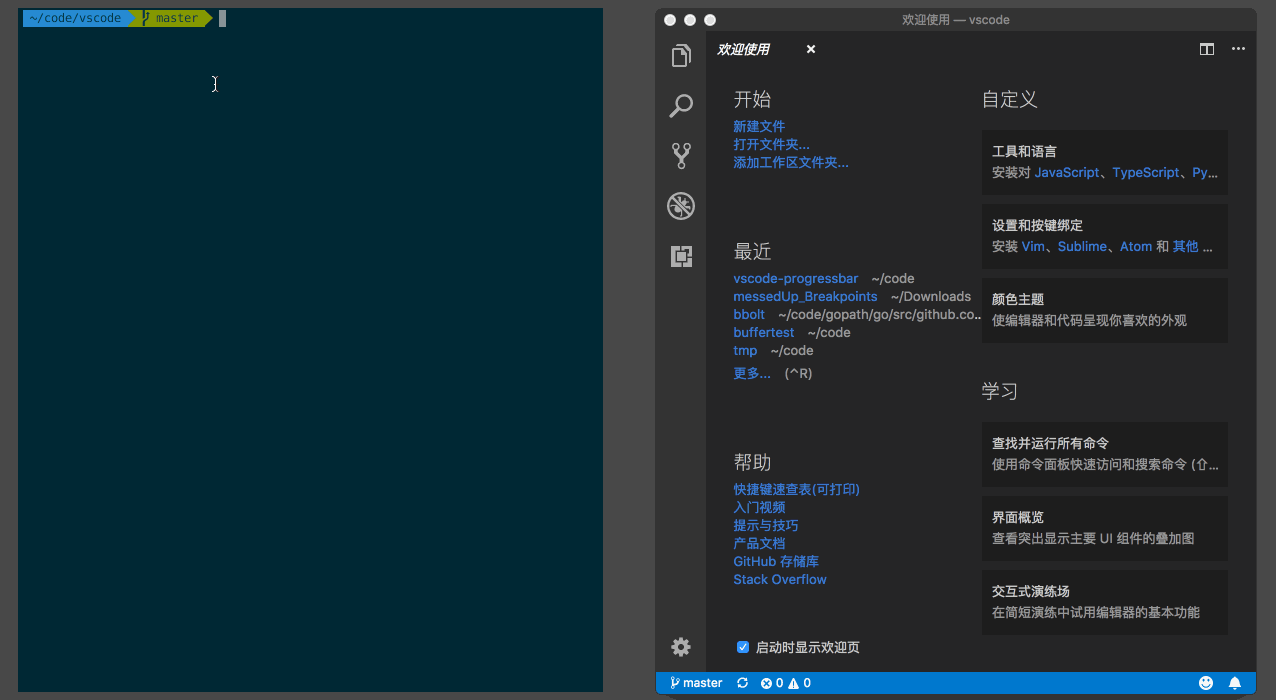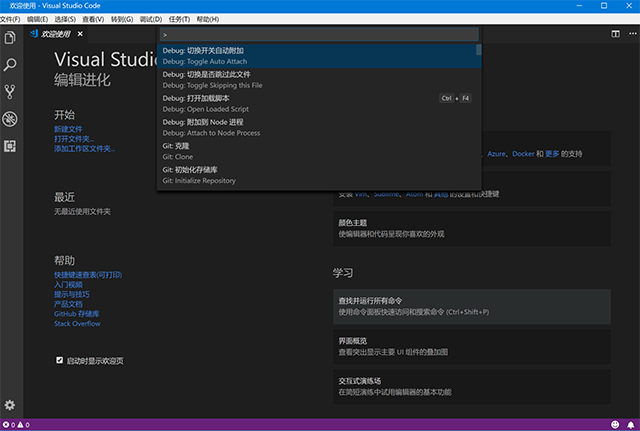 VS Code 第一次启动后会显示一个“欢迎使用”的页面,这个界面主要是方便你快速打开文件、文件夹以及访问历史文件,同时还会附带一些帮助信息,比如“快捷键速查表”。