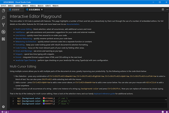 第三个是交互式演习场,打开这个界面,你会看到一个全英文的初学者教程,其中通过各种交互示例给出了 VS Code 的核心功能,展示了一些高级代码编辑功能的使用,每个功能都会有一个代码片段和编辑器供你实时使用。