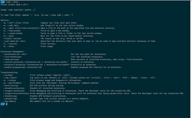 - 接下来,我们看一下 VS Code 的命令行都支持哪些操作,这里我先运行了 code --help来打印出 VS Code 命令行所支持的所有参数。