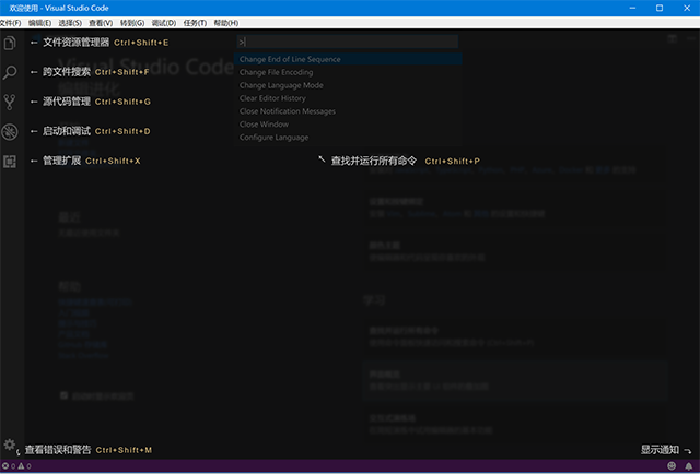 你可以在命令面板中快速搜索命令并且执行。如果你的 VS Code 是简体中文版,那么你可以在命令面板里使用中文或者英文来搜索命令。VS Code 的绝大多数命令都可以在命令面板里搜到,所以熟练使用命令面板,你就可以摆脱鼠标,完全通过键盘操作来完成全部编码工作。
