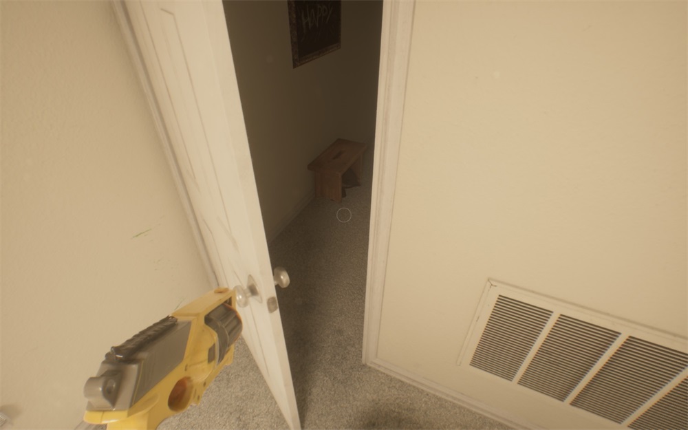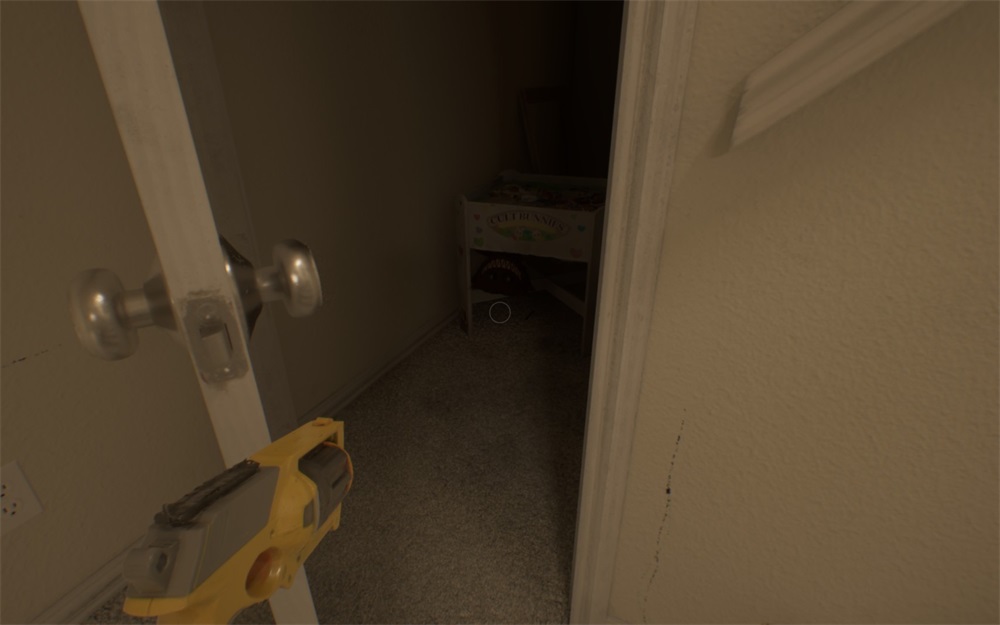 4、注意,直接走出这个门会直接死,所以请不要走出门去拿玩偶。我的建议是,在门口一点点蹭,尝试去够到玩偶,这样可以大概率防止坠机。还有一个更稳妥的办法,用房间里的软弹枪,在门打开后直接射击玩偶,关门游戏结束后便会获得成就。